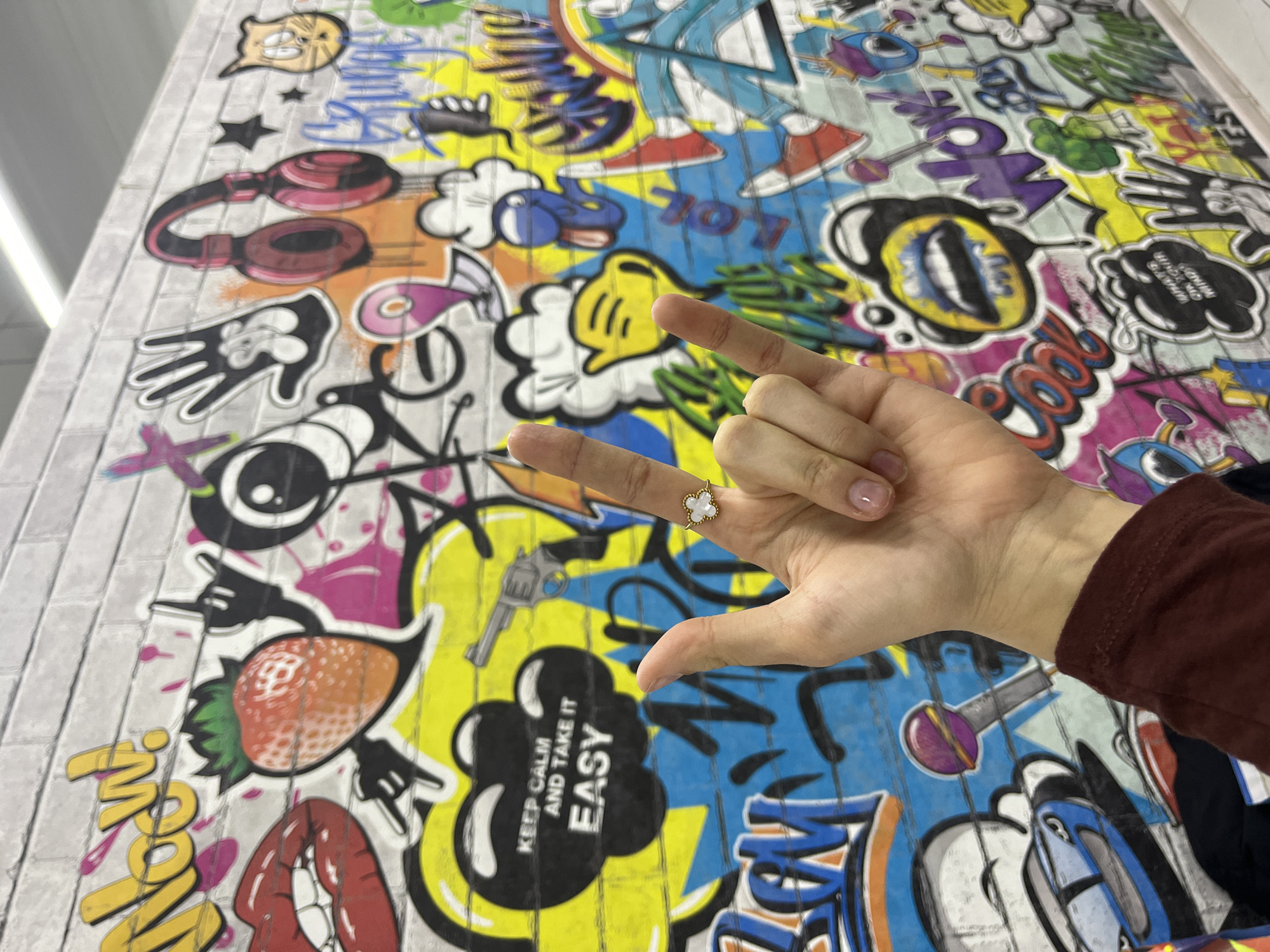 An individual's right hand, displaying a light skin tone with clear or light pink nail polish, is prominently featured in the foreground, making a "rock on" gesture with the index and pinky fingers extended. A gold-toned ring adorned with a four-petal white clover-like motif is worn on the ring finger. A maroon-colored long-sleeved garment is visible on the person's forearm. The hand is positioned against a brightly illuminated interior wall in Novonikolskoye, Russia, which is decorated with a full-coverage, multi-colored graffiti-style mural. The mural features a faux-brick background and incorporates various pop-art and cartoon elements including a red strawberry, red lips, red headphones, a silver revolver, a purple microphone, a blue car, black handprints, a cartoon cat head, and various speech and thought bubbles containing text such as "Now!", "KEEP CALM AND TAKE IT EASY", "Grunge", "Wow!", "Cool", and "WHAT'S ON YOUR MIND?". The color palette of the mural is vibrant, with dominant hues of yellow, blue, red, pink, and black. Artificial overhead lighting, characterized by long, white fixtures, is visible at the top of the frame, indicating an indoor setting. A light-colored baseboard runs along the bottom edge of the wall.