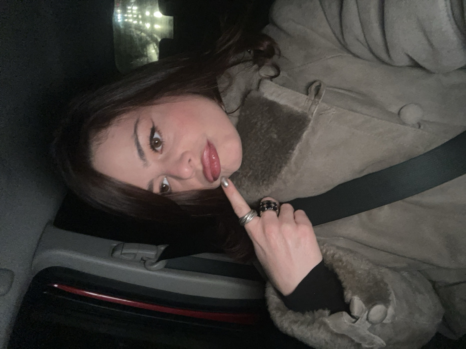 A woman with brown hair and makeup poses in a car. She wears a tan coat with a fur collar and a black shirt underneath. Her right hand, adorned with several rings, is raised, with her index finger pointing towards her lips. She has light skin, and her eyes are brown. A car seat and seatbelt are visible in the background. Lights can be seen outside the car window.