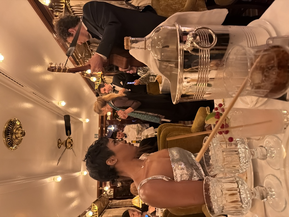 This image captures a formal dining or entertainment scene within a luxurious establishment, resembling a vintage train car, located in Beire-le-Fort, France. The interior features a white ceiling adorned with ornate gold-colored fixtures, including two ceiling fans and decorative lighting. Rich yellow-gold upholstered chairs are arranged throughout the space. In the immediate foreground, a white-linened table displays two empty clear stemmed glasses, a tall glass containing a light pink beverage garnished with a lime wedge and red berries, and a wider glass with a dark brown liquid. A silver-colored ice bucket, holding a clear glass bottle wrapped in a white cloth, is prominently positioned. On the left side of the frame, a woman with short dark hair, wearing a shimmering silver sequined sleeveless top and a butterfly pendant necklace, is seated in profile, looking leftward. In the midground right, a male musician with curly dark hair, dressed in a black suit, stands and plays an acoustic guitar. To his left, a blonde woman wearing a dark top and a light blue scarf stands, gesturing with her hands. Behind her, a man in a black tuxedo and bow tie holds an object, possibly a microphone, observing the interaction. Further in the background, a waiter in a white uniform carries a tray with items. Other patrons are partially visible, seated or standing, observing the performance; one individual in the mid-right is holding a mobile phone directed towards the musician.
