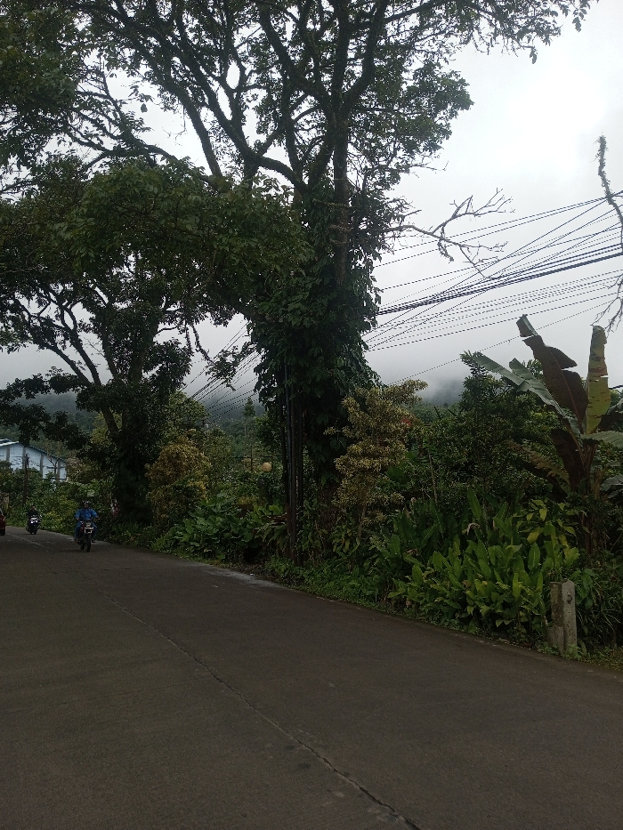 A winding asphalt road is flanked by dense vegetation. Lush green foliage fills the foreground and extends into the midground, including banana trees and various plants. A large tree with sprawling branches dominates the left side of the frame, partially obscuring a building. A power pole stands amongst the greenery, its wires stretching across the sky. A motorcycle travels on the road. A hazy mist envelops the distant mountains, softening the background.