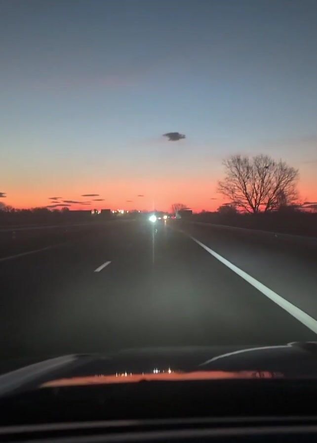 car driving on a highway at dusk. The sky is a mix of blue, orange, and pink. There are trees on either side of the road, silhouetted against the sky. Other vehicles can be seen in the distance, driving in the same direction. The camera is mounted inside the car, showing the view through the windshield.