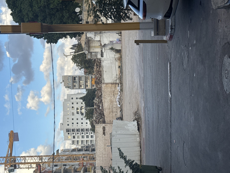The image depicts a construction and demolition site within an urban environment in Bnei Brak, Israel