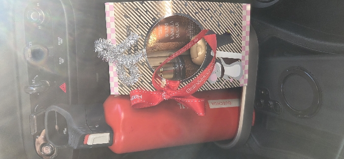 A gift set containing lotions and body wash, including "Warm Vanilla Sugar," rests upon a red water bottle labeled "Quechua." A red ribbon with white stitching ties the set together. Metallic tinsel is attached near the ribbon. The items sit inside a black vehicle, with dashboard elements and speaker visible on either side.