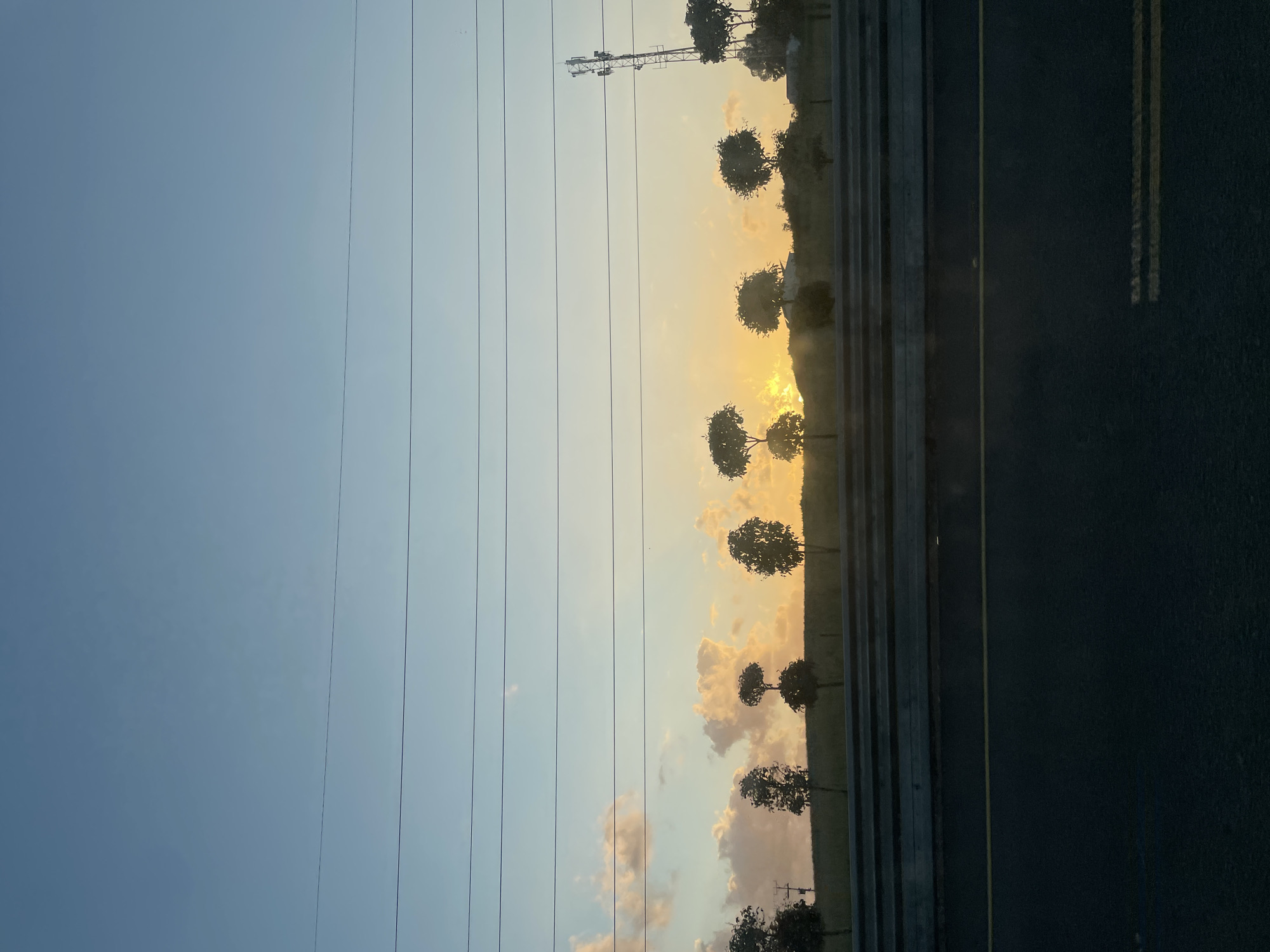 The image depicts a view from a moving vehicle in Givat Hen, Israel. A clear, light blue sky occupies the left portion of the frame, with electrical wires visible. The central area shows a sunset or sunrise with yellow and orange hues, scattered clouds, and a line of trees. A communication tower stands among the trees. To the right, a segment of asphalt road is visible, marked with yellow lines. A crash barrier runs along the edge of the road. There are no people visible in the image. The image is oriented vertically.