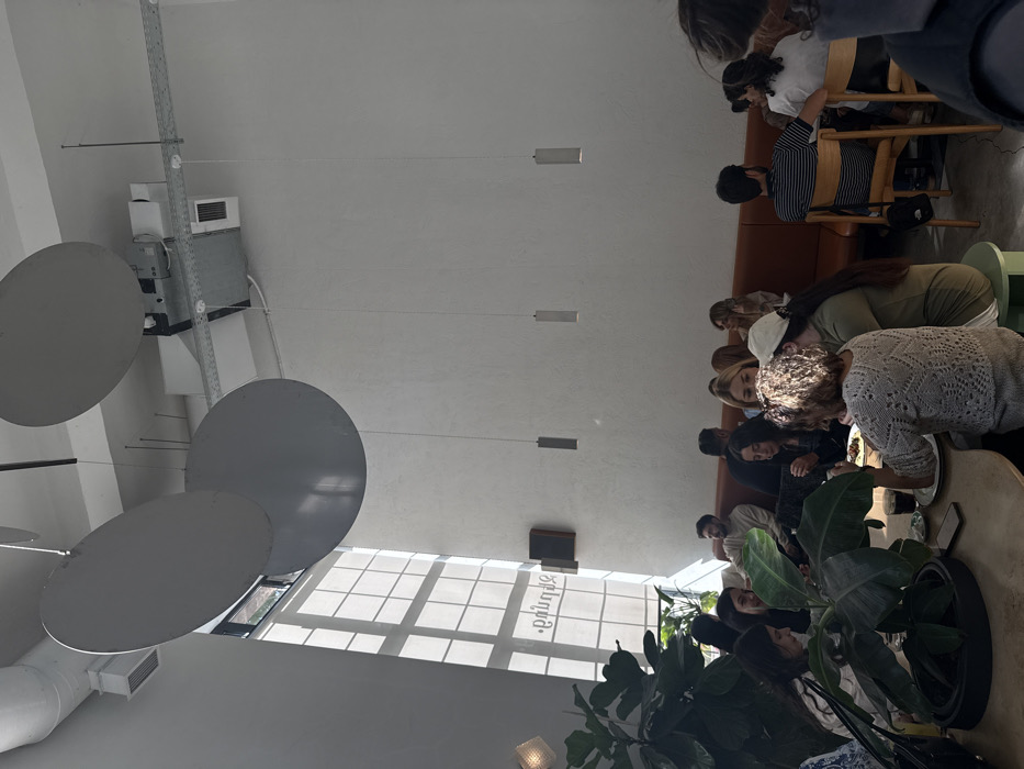 The image depicts the interior of a modern cafe or restaurant in Yerevan, Armenia. The space is brightly lit by natural light entering through a tall, multi-paned window on the left, which reflects vertically oriented Armenian text prominently displaying "ԳՐԱՆԴ" (Grand) along with other characters. The ceiling is high, featuring exposed silver-colored ventilation ducts, white pipes, and multiple large, flat, grey circular panels suspended at various heights, likely for acoustic or decorative purposes. Several minimalist cylindrical pendant lights hang from the ceiling, and a square-shaped light fixture is mounted on the upper left wall. Approximately 15 to 20 individuals, appearing to be young adults to middle-aged, are seated throughout the establishment. In the foreground, a large potted plant with broad green leaves partially obscures a light-colored round table. An older woman with light, curly hair, wearing a cream-colored open-weave sweater, is seated at this table, looking down at a plate containing food. Her right forearm rests on the table. Adjacent to her, a person with long dark hair and a white baseball cap is seated on a light green stool, wearing an olive-green long-sleeved top. On the table, plates of food, beverages in glasses (including a dark liquid), and a mobile phone are visible. Further back, guests occupy a continuous, low-backed, orange-brown upholstered banquette along the right wall and are seated at light-colored wooden tables with matching wooden chairs. Individuals are engaged in conversations, eating, and drinking. One man with a beard and a light sweater is visible along the banquette, looking towards the center-left. Another man with dark hair and a striped t-shirt is seated with his back to the camera on a wooden chair. The walls are uniformly white or light grey, and a rectangular brown panel, possibly a speaker, is mounted on the left wall below the reflected window text. The floor appears to be a light, possibly concrete or tiled, surface.