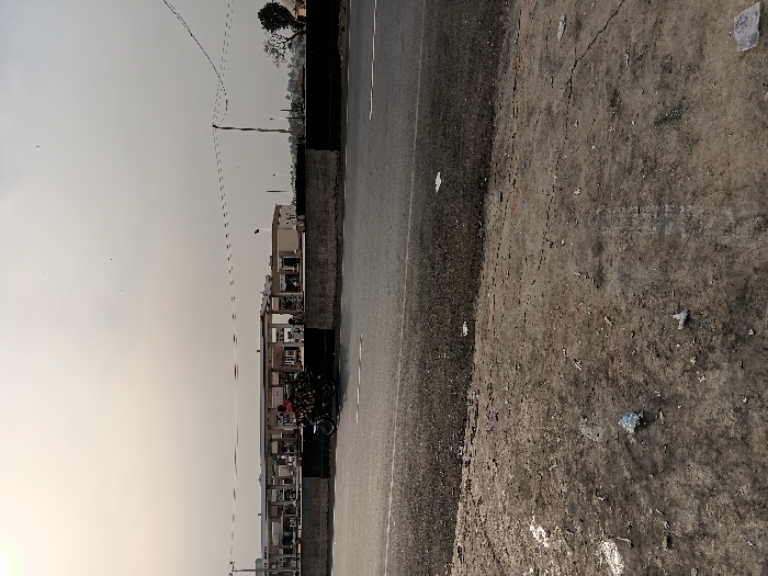 A long shot captures an urban landscape under a hazy sky. An asphalt road stretches into the distance, bordered by a textured, gravelly verge. Buildings line the opposite side of the road, with a parked motorcycle visible near the curb. Overhead, power lines extend across the sky. Scattered debris is visible on the ground, adding to the scene's gritty realism.