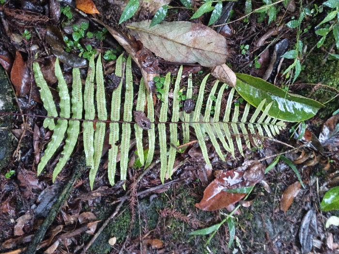 A decaying forest floor is depicted with wet leaves, twigs, and moss. A bright green fern lies across the center, with its leaflets arranged symmetrically. A brown leaf is directly above the fern, and a glossy green leaf is to the right. Dark, damp soil and small green plants fill the background. The scene conveys a sense of moisture and decomposition.