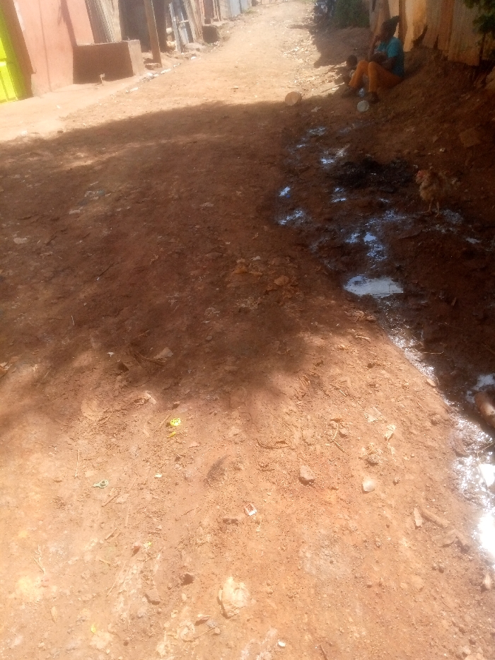 An unpaved road stretches into the distance, bordered by buildings on the left and a small embankment on the right. The road surface is mostly brown dirt with patches of standing water. A person sits on the embankment in the background, and a chicken stands near the water. Litter and debris are scattered across the ground. Shadows fall across the road.