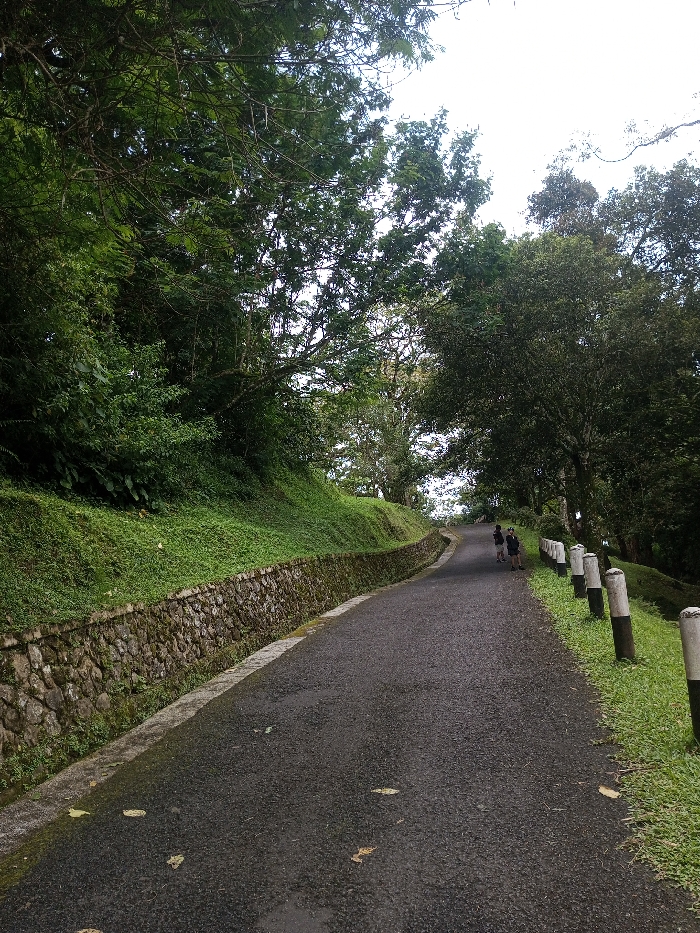 The image depicts a paved asphalt road ascending through a heavily vegetated area in Kanand, India. The road is dark gray, possibly damp, with scattered light brown leaves. On the left, a stone retaining wall, approximately 0.5 meters high and covered in moss and lichen, supports a steep, grass-covered embankment. Above the embankment, dense green foliage and trees rise, partially obscuring the sky. A narrow concrete gutter runs along the base of the retaining wall. On the right side of the road, a grassy verge slopes upwards into more dense trees. A series of approximately six white and black painted cylindrical bollards or posts are spaced along the right edge of the road, delineating the pathway from the adjacent terrain. Further up the road, two individuals are walking away from the camera on the right side of the asphalt, near the bollards. They are dressed in dark clothing. The road curves gently to the right as it ascends out of view. The sky, visible through gaps in the tree canopy, appears bright and overcast.