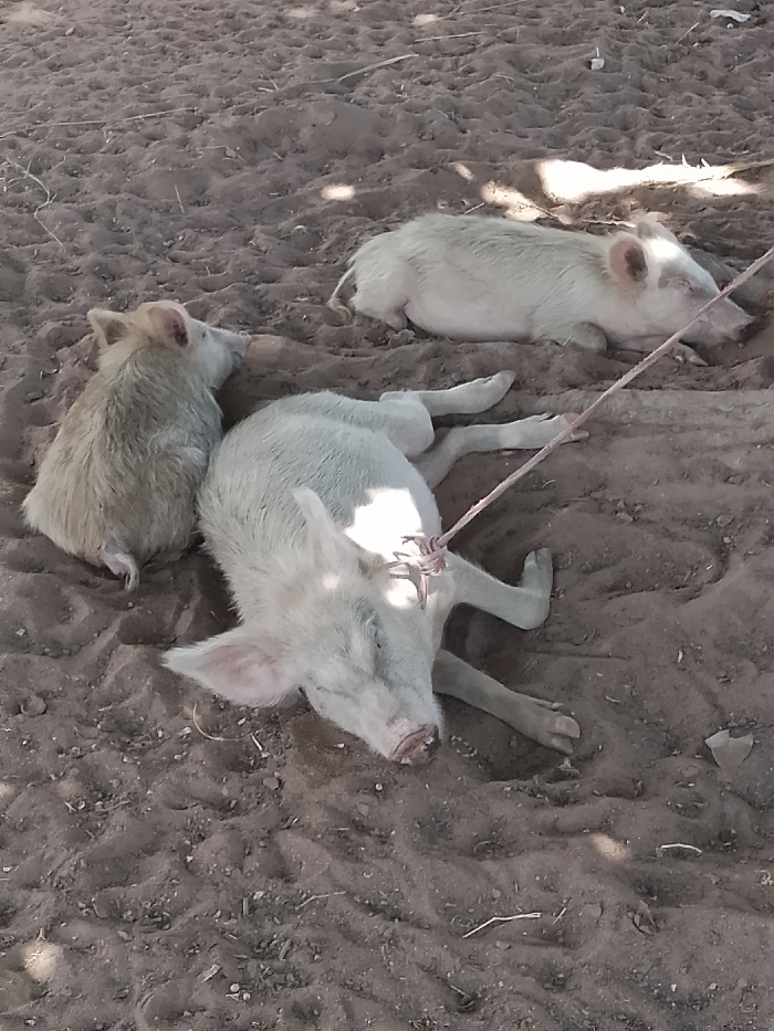 - "This image, captured in Shendam, Nigeria, depicts three light-colored pigs resting on bare, reddish-brown soil under partial shade" by FM-Zezex1, licensed under CC BY 4.0