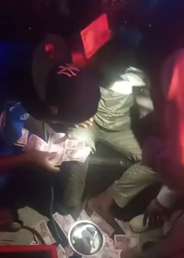 three men in what appears to be a club setting. One man is sitting on a tufted black leather couch wearing a traditional African cap. Another man in a blue tracksuit and a blue NY cap is counting stacks of Nigerian Naira notes. A third man in a white shirt is recording the scene with his smartphone. There are scattered Naira notes on the floor. The room is dimly lit with pink and blue lighting. There is a microphone stand visible near the couch.