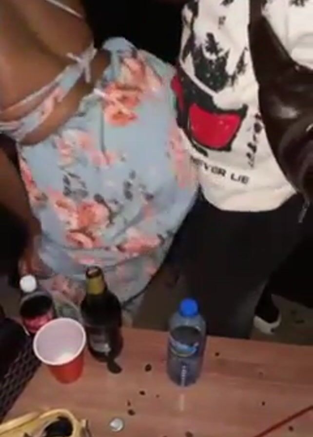 close-up of a wooden table at what appears to be a party. On the table are several drinks including a bottle of soda, beer, and water, along with a red plastic cup. There are two people standing near the table, a woman wearing a floral print dress, and a person in a white T-shirt with black jeans and a brown crossbody bag. The person in the white shirt briefly touches the woman's lower back before the video ends.
