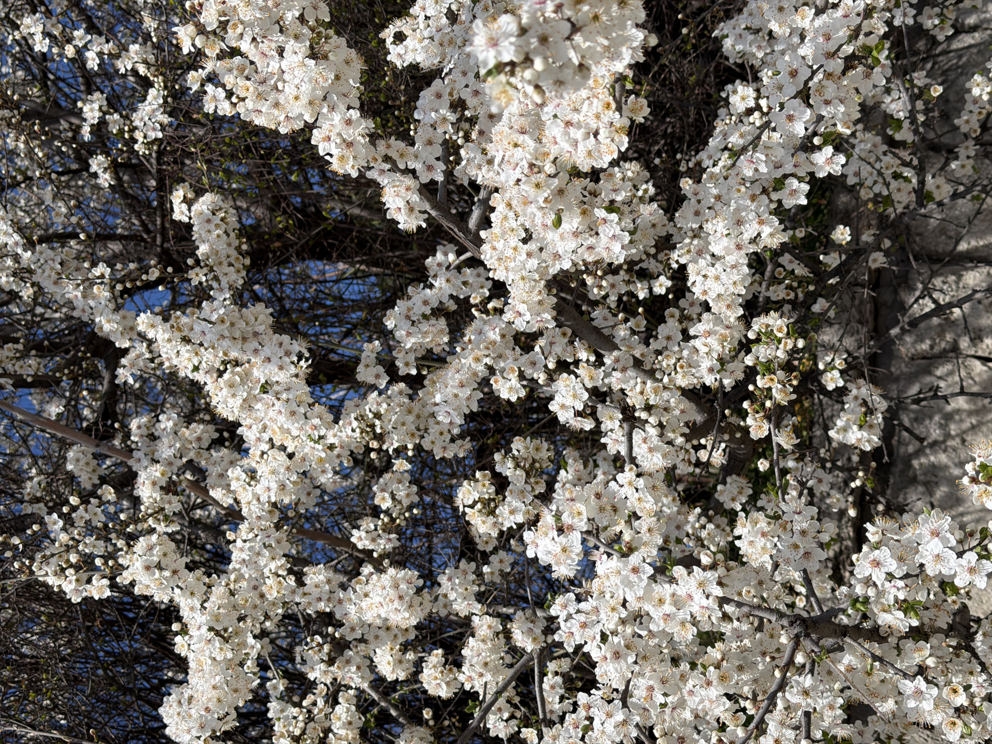 The image displays a dense cluster of white blossoms from a deciduous tree, indicative of early spring, in Varna, Bulgaria. The foreground and midground are filled with numerous small, five-petaled white flowers, many exhibiting yellow-tipped stamens. These flowers are attached to dark, bare branches and intertwining twigs. Behind the flowering branches, patches of clear blue sky are visible in the upper and central areas of the frame. Towards the lower section, a partially obscured, light-colored, textured stone or concrete wall is discernible, behind which some dark, leafless shrubbery is also present. No individuals, animals, or specific human activities are visible. The scene is illuminated by natural daylight.