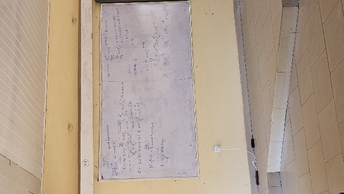 This image depicts the interior of a classroom or lecture hall in Hayin Banki, Nigeria, devoid of people. A large, rectangular white whiteboard occupies the central portion of a light yellow wall, covered extensively with mathematical equations, symbols, and text related to Digital Signal Processing, including "DFT" and summations. Below the left side of the whiteboard, a white electrical wall outlet is visible, from which a white charging cable extends downwards, resting on a raised concrete platform. Two dark, cylindrical objects, possibly markers or parts of a charger, lie near the end of the cable on the platform. The platform, constructed from light-colored concrete blocks, rises from a tiled floor with light brown square tiles. Above the whiteboard, a horizontal white trim strip runs along the wall, bearing a circular sticker with the number "14" and a faint inscription "SFFS03/0". The ceiling consists of white suspended ceiling panels with a visible grid structure.