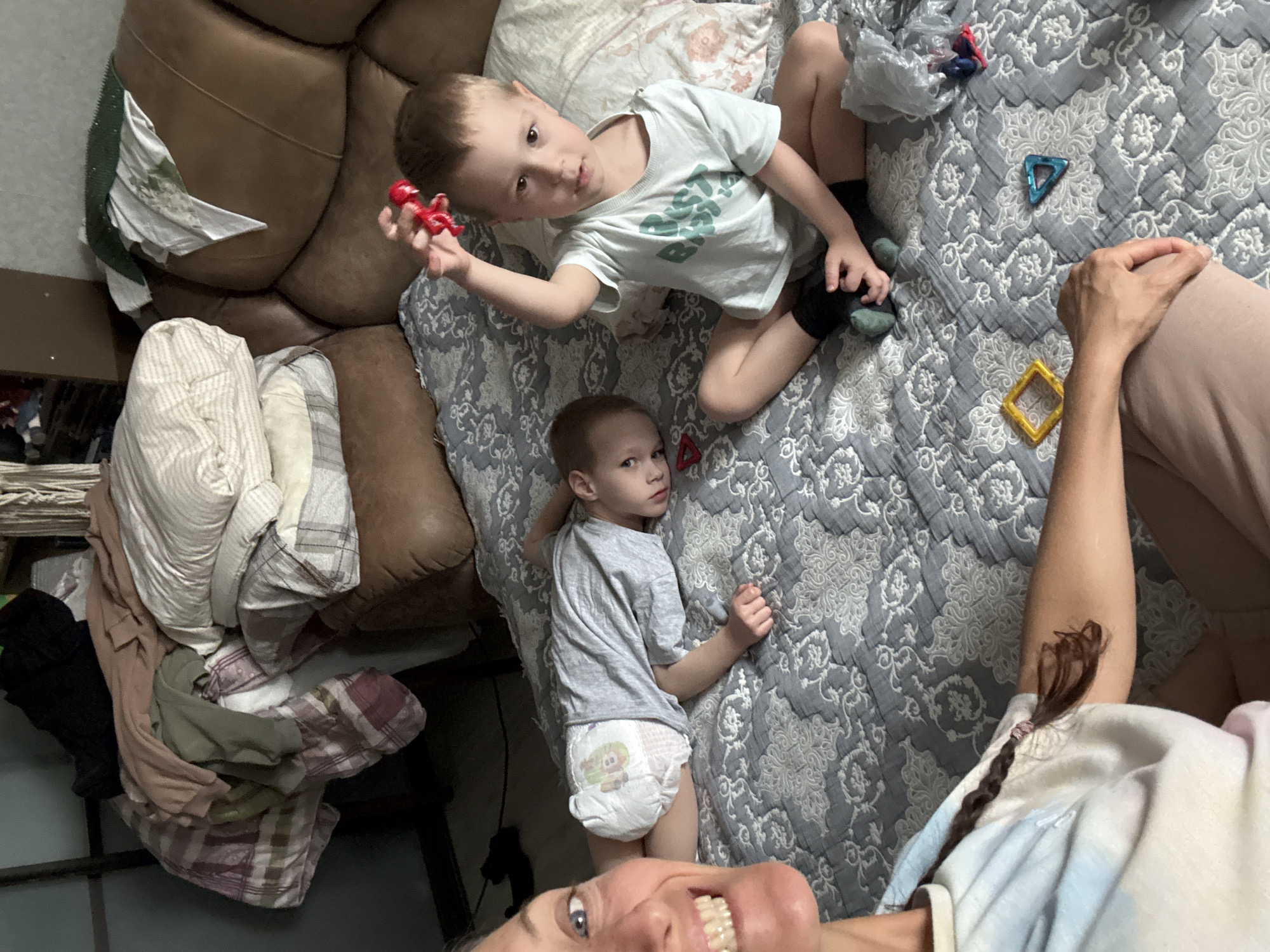 The image presents an interior scene with two young boys and a woman. The boys are lying on a gray patterned bedspread. One boy, wearing a white t-shirt, is holding a red toy. The other boy is wearing a gray t-shirt and a diaper. The woman's face and shoulder are visible at the bottom of the image. The room contains a brown sofa, covered with blankets and clothes. No information indicates this scene is located in Ulyanovsk, Russia.