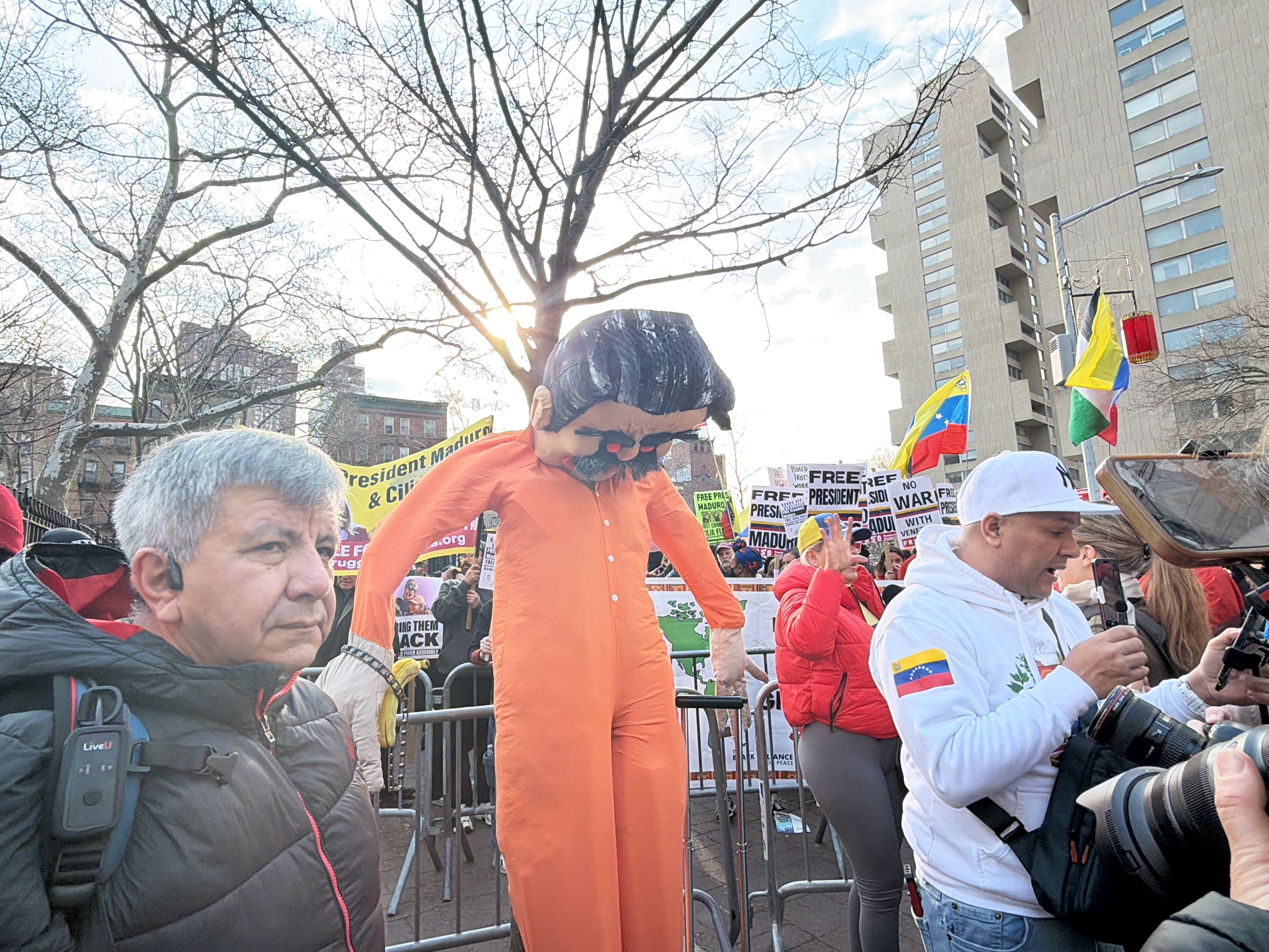 An outdoor protest is depicted at United Nations Plaza in New York City, United States, likely on a clear but cool day. In the immediate foreground, to the left, a middle-aged male with short gray hair and a mustache, wearing a black puffer jacket over a red layer, looks towards the right. A communication device is clipped to his left shoulder strap, with an earbud visible in his right ear. Central to the image, behind a metal crowd barrier, stands a large, human-shaped effigy. This effigy, approximately life-sized, has a dark-haired head with a beard and wears a bright orange jumpsuit, reminiscent of prison attire. Its arms are slightly outstretched, and its visible left hand appears to be made of light-colored fabric with a dark band around the wrist. To the right, a male individual in a white hooded sweatshirt, blue jeans, and a white baseball cap is engaged with professional camera equipment, holding a camera body with a large lens, suggesting a role as a videographer or journalist. A Venezuelan flag patch is visible on the left sleeve of his sweatshirt. In the midground, behind the effigy and videographer, several individuals are present, including one person in a red puffer jacket. Multiple protest signs are visible; one yellow sign partially reads "RESIDENT Maduro & Ci...", while white signs with green text display phrases such as "FREE PRESIDENT...", "FREE PRESS...", "MADURO", and "NO WAR... WITH MADURO." Two flags are prominently displayed on poles: the national flag of Venezuela and what appears to be the national flag of Guyana. The background features bare deciduous trees and a tall, light-colored, multi-story building with numerous rectangular windows, consistent with the architecture of the Millennium Hilton New York One UN Plaza, located adjacent to the United Nations Headquarters. Sunlight illuminates the upper background from a low angle.