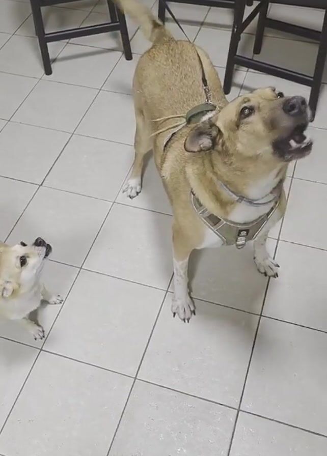 Two dogs are in a room with white tiled floors, with black stools in the background. A tan-colored dog, harnessed and leashed, stands in the center of the shot, looking up and barking. Its tail is wagging slightly. A smaller, tan dog on a leash stands to the left, looking up at the larger dog and also barking. A foot in a sneaker is visible in the top left corner of the frame.