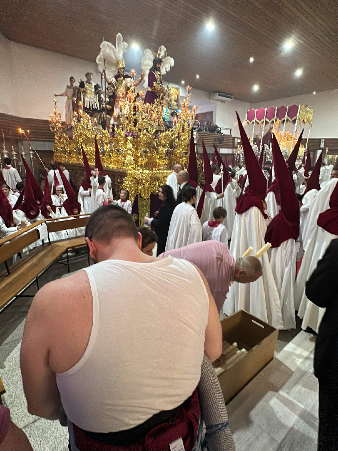 Inside a building, a group of people are gathered, many wearing white robes and maroon hoods. Some individuals are bending over a cardboard box filled with white candles. In the background, there is a large, ornate golden structure featuring figures, possibly religious icons. Benches are visible along the sides of the room. The scene appears to be taking place in Jerez de la Frontera, Spain, based on the attire and possible religious procession taking place.