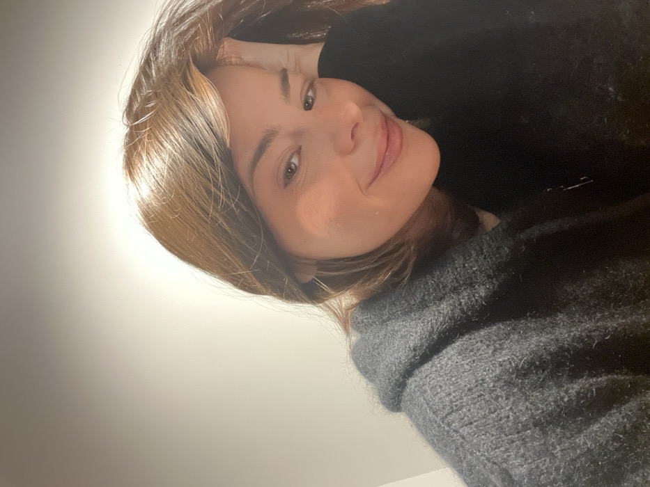 A woman with shoulder-length brown hair smiles faintly at the camera. She wears a dark gray sweater and a black top or sweater underneath. Her left hand rests on the back of her head, slightly obscuring part of her hair. The lighting is bright, illuminating her face from the side, casting a soft glow on her skin. The background is plain and light-colored, possibly a wall. The image is taken at a tilted angle, adding a casual and relaxed feel.