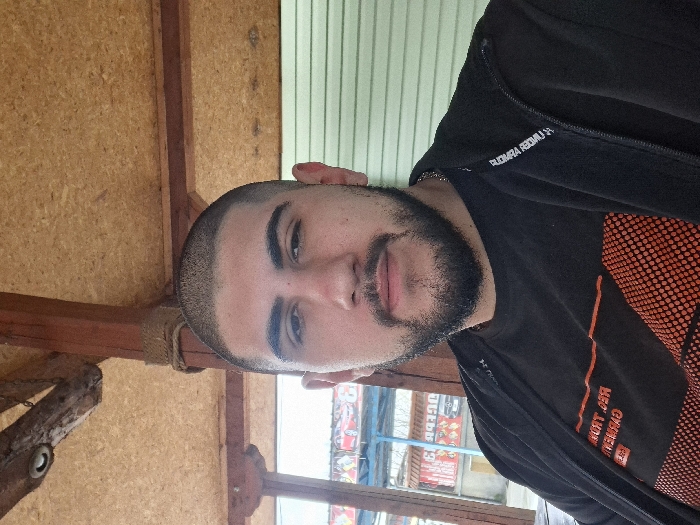 A head-and-torso level self-portrait depicts an adult male positioned centrally under a covered outdoor structure. The male has short-cropped dark hair, a full dark beard, and dark eyebrows, with a neutral expression and direct gaze. He wears a black short-sleeved t-shirt with orange text and a dotted pattern, and a black zip-up fleece jacket, partially open, with visible "UNDER ARMOUR" branding on the right shoulder. A silver-colored chain is visible around his neck. The overhead structure consists of a light-colored oriented strand board (OSB) ceiling supported by dark wooden beams and a vertical post secured with rope. The background on the left reveals a blurred street scene with commercial elements, including a blue awning, a sign with reversed Cyrillic text ("ОБЪЕКТ 13"), and vehicles. The background on the right features a light green slatted wall or blind. The location is in the city of Unknown, Unknown.