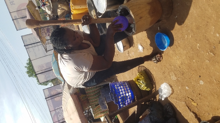 The scene captures an outdoor market environment in Gura Top, Nigeria, under bright daylight. A single adult female, with dark hair styled in braids, wearing a light-colored t-shirt and dark trousers, is shown in a bent posture. She is actively pounding or grinding with a large, dark wooden pestle, which she holds with her right hand inside a large, light-brown wooden mortar. Her left hand holds a small purple plastic scoop over the mortar, which contains a white, granular substance. On the reddish-brown dirt ground near her feet, a small light-blue plastic bowl is present, along with several irregular pieces of a white substance, one partially encased in clear plastic. To the left, a blue plastic basket sits near a yellow bag and black plastic bags, indicating merchandise. In the background, various metal pots, several large yellow plastic jerrycans, and multiple commercial billboards with advertisements are visible under a light blue sky with thin power lines stretched across. The ground is unpaved, consistent with an open-air market.