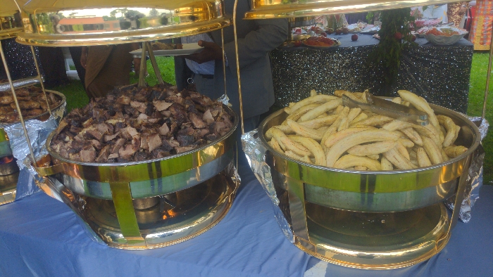 This image captures an outdoor food buffet scene in Kondeni, Tanzania