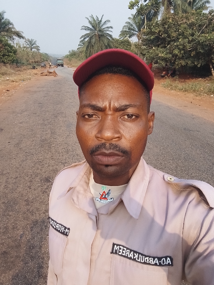 A man in a tan uniform and maroon cap stands on a paved road. His name tag reads "AO ABDULKAREEM". The background includes palm trees, and other greenery. In the distance, a truck and other vehicles are visible with some people standing next to the road.