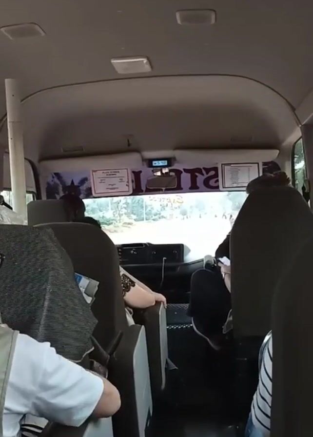 interior of a van-like vehicle from a rear passenger perspective. Several people are seated inside, and one person in the foreground is wearing a white top and has bracelets on their wrist. Through the front windshield, a street scene is visible with people walking. The dashboard includes a digital clock showing 5:48, various stickers, and a rearview mirror. The vehicle appears to be in motion.