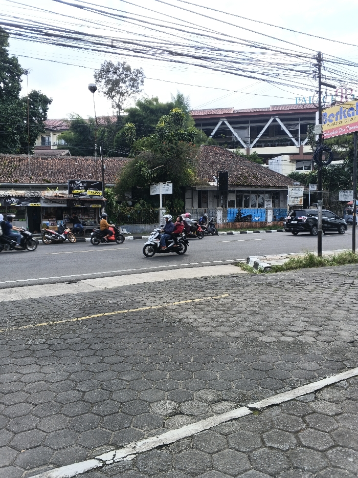 The image depicts an urban street scene in Bien Hoa, Vietnam, under an overcast sky. Prominent commercial signage within the image, such as "PERALATAN Dapur" and "BERKALI...", is in Indonesian. The foreground features a sidewalk composed of dark hexagonal interlocking pavers, exhibiting wear and minor cracks, with a faint yellow dashed line on its surface. A cracked white line marks the edge of the asphalt road. On the road, approximately ten motorcycles and scooters, in various colors including white, red, orange, and dark blue, are in motion, some carrying two riders, all wearing helmets. A black four-door sedan is visible on the right side of the road, moving away from the viewer. Along the left, a row of older-style buildings with reddish-brown tiled roofs houses multiple ground-floor storefronts. One shop displays a green banner with "MAGNUM FILTER" and "$29,000" visible. Dense green trees and foliage are present behind and between these structures. Overhead, a dense network of utility wires spans the sky, supported by multiple poles. A single street lamp is affixed to one of these poles. In the background, a larger, multi-story building with a distinctive white triangular truss structure supports an upper section topped by a red roof. A partial sign on this building reads "PATIO..." and "BERKALI... Peralatan Dapur...".