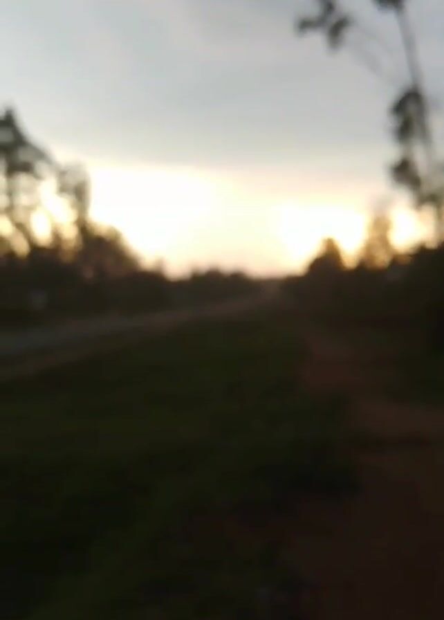 n out-of-focus scene of a landscape at sunrise or sunset. There's a dirt path in the foreground, with darker greenery covering much of the scene. A road is visible in the middle ground, with blurred trees on either side. The sky is bright with the sun low on the horizon, creating a hazy, golden glow.