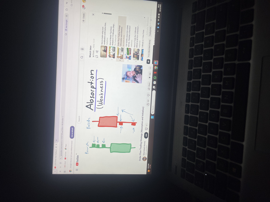 This image, captured in Kano, Nigeria, shows a laptop screen displaying a YouTube video in a dimly lit environment. The laptop's keyboard, primarily black, is visible in the foreground, illuminated by the screen's light. The screen features the Google Chrome browser, open to a YouTube page playing a video titled "Order Flow Trading Strategy (Absorption and Initiation)" from the channel "Mind Math Money." The video content displays a whiteboard-style diagram illustrating "Absorption (Weakness)," with a green candlestick labeled "Bearish" and a red candlestick labeled "Bullish," both annotated with directional arrows. A smaller embedded window within the video shows a bearded man, presumably the presenter, gesturing. To the right, a "Watch later" playlist is visible, listing other trading-related videos. The Windows taskbar is present at the bottom of the screen, indicating the time as 08:32 and the date as 20/12/2023. A battery status of "UTD/UNR -0.79%" is displayed on the bottom left, and an "Activate Windows" watermark is visible on the bottom right of the screen.