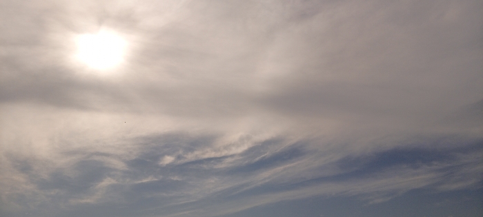 The scene is an overhead view of a sky at an unknown time of day, located in Unknown, Unknown. The sun is visible as a bright, overexposed orb in the upper left, partially obscured by and radiating through a layer of diffuse, light grey-white clouds that dominate the upper and central portions of the frame. Below these, and extending towards the lower right, are thinner, streaky cloud formations against a visible backdrop of blue sky. A solitary, small, dark, unidentifiable object, possibly a bird or insect, is present in the mid-left region of the sky. No individuals, ground features, or man-made structures are discernible.
