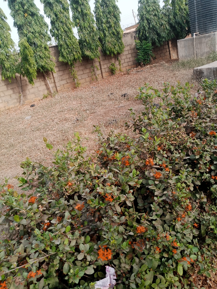 An exterior shot shows a brick wall topped with tall, thin green trees lining the back. A dry, grassy area fills the middle ground. In the foreground, a dense bush with orange flowers dominates the view. A piece of white trash lies near the bottom of the frame. A water tank sits near the wall on the right.