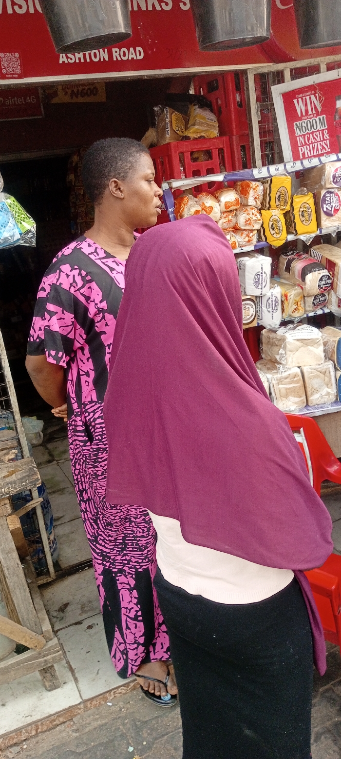 Two women stand near a roadside vendor. One woman wears a pink and black patterned dress and black sandals. The other woman wears a black skirt, white top, and a large maroon headscarf that obscures her face. The vendor's stall displays various loaves of bread. A red sign advertises the chance to win money and prizes. The sign above the vendor's stall includes the words "Ashton Road".