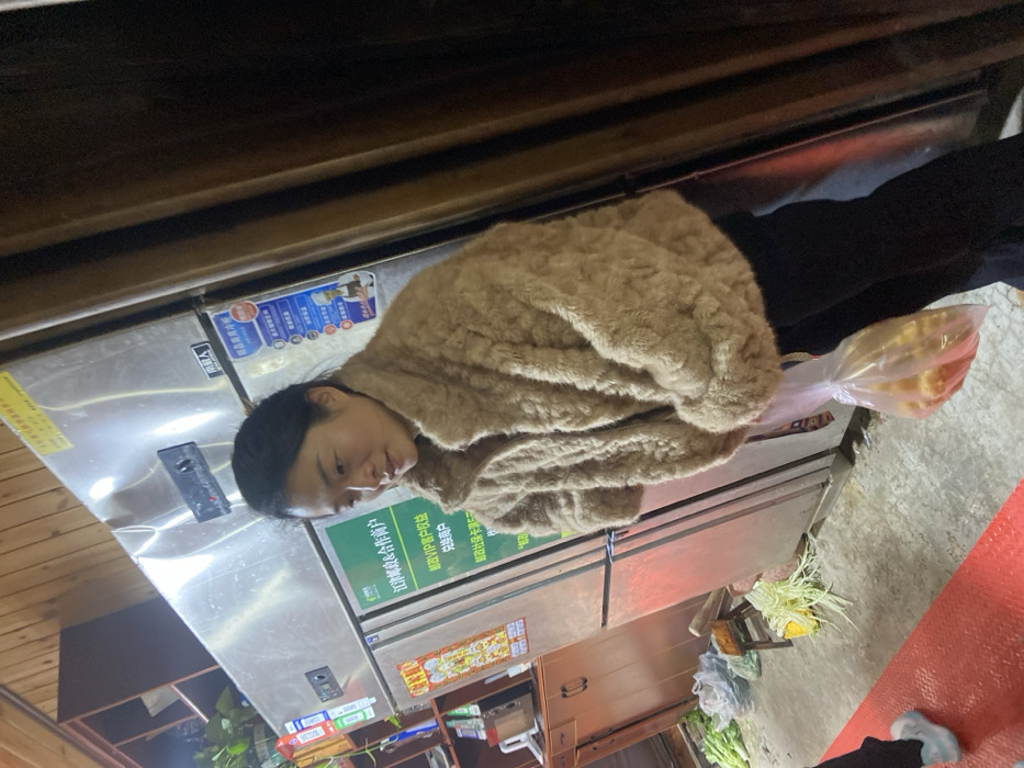 A woman in a fuzzy, tan jacket stands in front of a stainless steel refrigerator. The fridge has labels and stickers on it, including one that reads "Jiangjin Postal Service & Cooperative Merchant." The area around the fridge has loose vegetables and what looks like a bag of food. A wooden paneled wall is visible in the background.