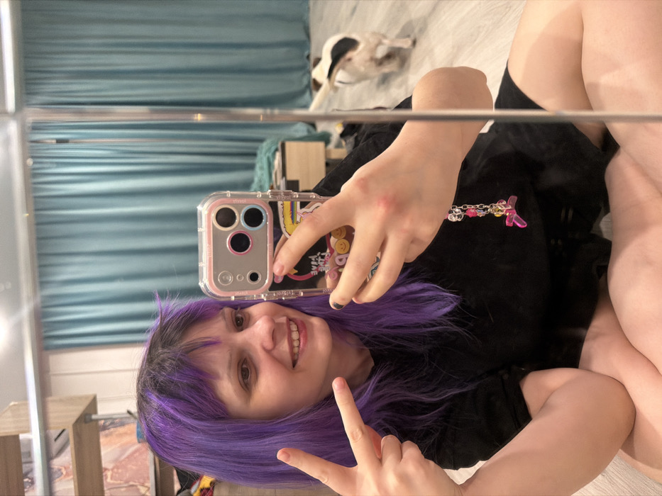 A woman with vibrant purple hair smiles and makes a peace sign while taking a mirror selfie with her phone. The phone case is clear with a pink border and a colorful design. She is wearing a black shirt. In the background, a blue curtain hangs behind a small wooden bedside table. A black and white dog lies on the floor near the curtain.