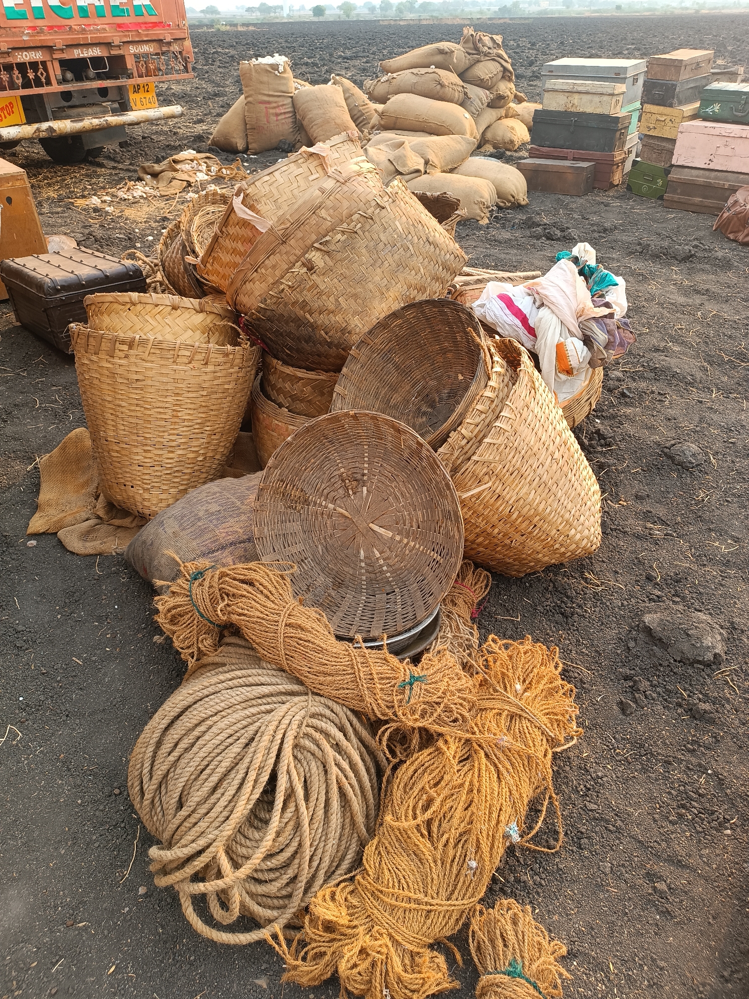 The scene depicts an outdoor staging area in Kottalapalli, India, likely an agricultural field or dirt track, with dark, uneven soil. In the foreground, a large coil of light brown rope lies horizontally, accompanied by multiple bundles of smaller, darker fibrous ropes secured with green ties. Various woven bamboo baskets, ranging in size and shape, are arranged around these ropes, with some nested and others overturned. One basket contains an assortment of folded fabric pieces, including white, red, and blue textiles. A dark brown metallic trunk is positioned behind the baskets on the left. In the midground, a substantial pile of numerous burlap sacks, filled and bulging, rests on the ground. Adjacent to these sacks, a collection of assorted metal trunks and chests, varying in size and color (including grey, dark green, brown, pink, and yellow), are stacked in multiple columns. White, fibrous material, resembling cotton bolls, is scattered on the ground near the base of the burlap sacks. To the far left, the rear section of a reddish-orange truck, identified by "EICHER" lettering and an Indian license plate "AP 12 V 6740", is partially visible. The truck features "HORN PLEASE" and "SOUND" stenciled on its bumper, and a "STOP" sign. The background consists of a flat, open field stretching towards a hazy horizon, with indistinct vegetation or distant structures. No individuals are present.
