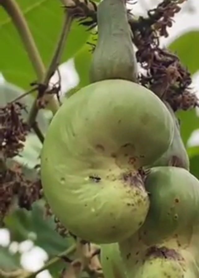 several green, unripe cashew apples hanging from a branch, surrounded by green leaves and what appear to be dried remnants of flowers or stems