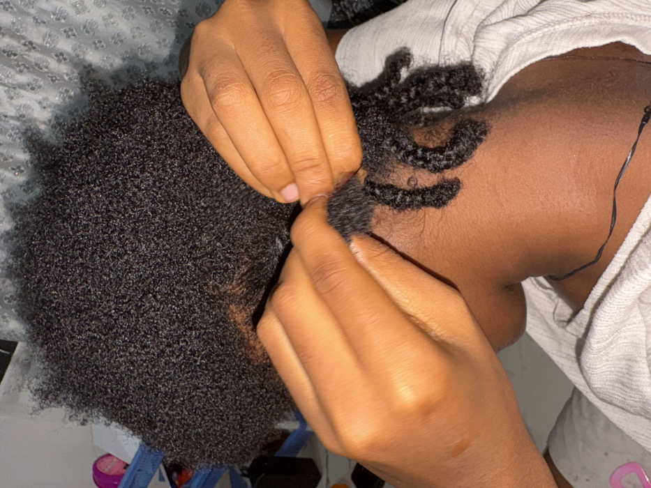 close-up of a person's head and hands. The person appears to be in the process of braiding or styling hair. One hand is holding a section of curly hair, while the other hand seems to be adding it to existing locs or braids. The person has dark skin and is wearing a white shirt. The background is out of focus but shows a patterned surface.