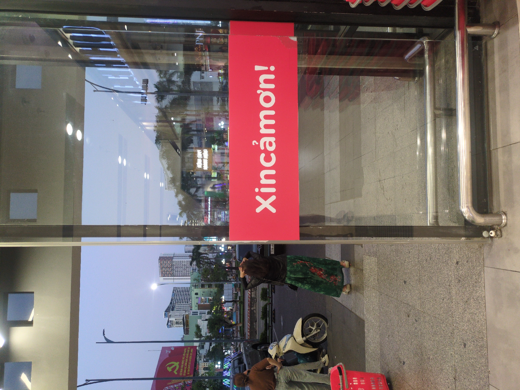 Here is a detailed description of the image: **Scene Overview:** The image captures a street scene in Quy Nhon Ward, Vietnam, as reflected through the glass entrance of a business. The glass door has a red banner with white text that reads "Xincảmơn!" which is Vietnamese for "Thank you!". The view through the glass features a street lined with buildings, palm trees, and streetlights. In the foreground, outside the glass doors, there are two people on the pavement. **People:** One person is standing near a parked motorbike. They are wearing a green and black patterned dress with a black jacket. Another person is sitting on the motorbike and is wearing light-colored jeans and a brown top. There is also a red shopping basket on the sidewalk near the sitting person. **Objects:** Besides the people, the key objects visible include the glass entrance door with metal handles, a red banner on the door, a parked motorbike, a red shopping basket, streetlights, buildings, palm trees, and distant high-rise structures. **Actions and Interactions:** The person in the dress appears to be standing and looking towards the street. The person sitting on the motorbike appears to be conversing or waiting. **Environment:** The overall environment appears to be an urban area, judging by the building structures and street layout. The light suggests it's dusk or early evening. **Location:** The setting is Quy Nhon Ward, Vietnam. This is confirmed through the banners that are also printed in Vietnamese.