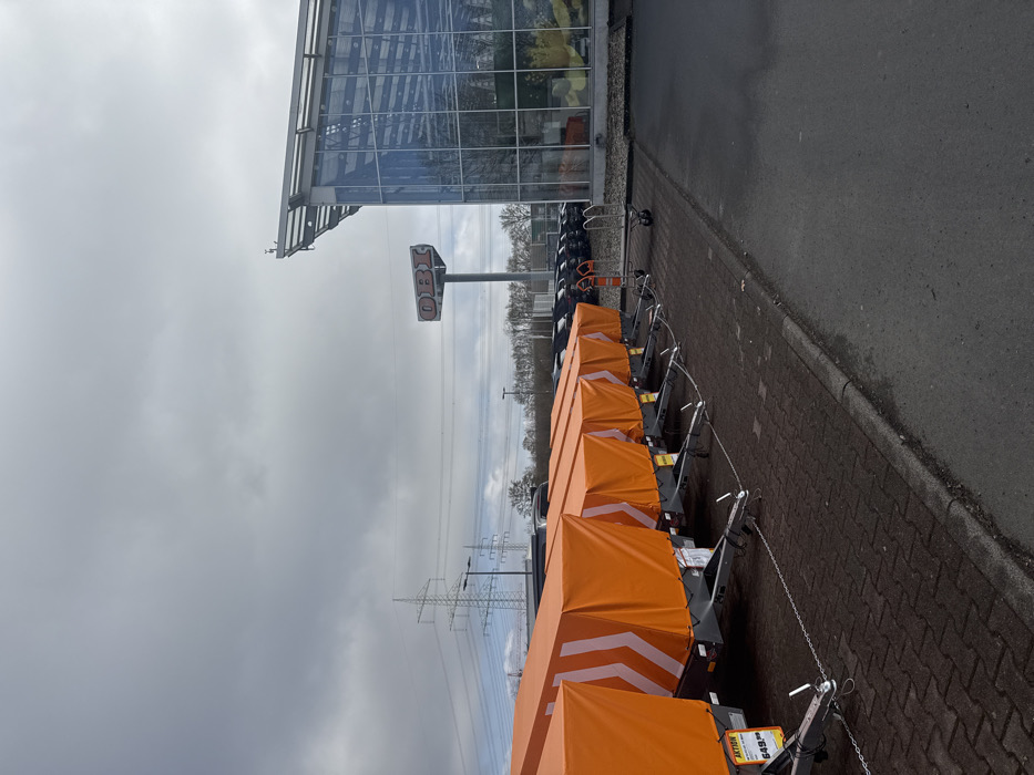 This image depicts the exterior of an OBI store in Gießen, Germany, under an overcast sky. The foreground features a linear arrangement of approximately ten small utility trailers, each covered with a bright orange tarpaulin displaying a white chevron pattern pointing right. The trailers are secured by chains connecting their hitch couplers. A yellow-red price tag on the leftmost trailer indicates "AKTION" and a price of "549,-". The trailers are positioned on a paved surface composed of dark grey interlocking bricks, separated by a concrete curb from a darker asphalt parking area. In the midground, a two-wheeled hand truck with an orange handle is visible on the asphalt near the store entrance. Beyond the trailers and hand truck, a parking lot contains multiple dark-colored vehicles. The background is dominated by a large, modern OBI store building featuring an extensive glass facade, reflecting the cloudy sky. A tall pole sign displaying the "OBI" logo in red and white is located between the parking lot and the building. Further in the background, a line of deciduous trees without foliage suggests a cold season, and multiple high-voltage electricity pylons with power lines stretch across the horizon. No individuals are visible in the scene.