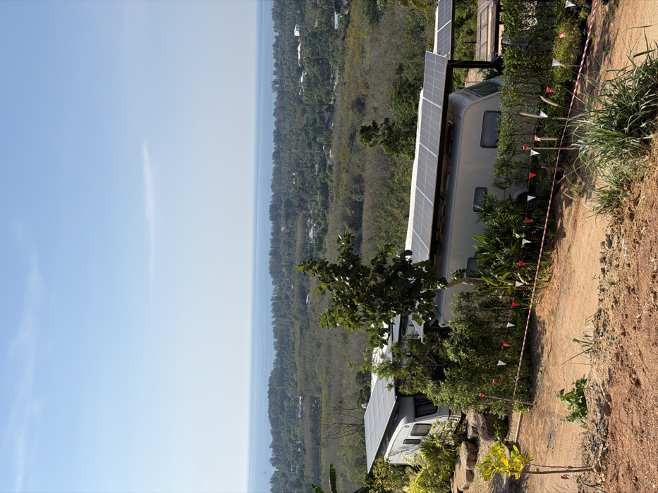 The image depicts an elevated panoramic view overlooking Mai Khao, Thailand, on a clear day. In the foreground, a reddish-brown dirt path occupies the lower portion of the frame, bordered by sparse dry grass and small plants. A white and red striped barrier tape with small triangular pennant flags (red, white) runs horizontally across the mid-foreground, demarcating an area. To the left, several large, smooth light-brown rocks are visible. The midground features two silver-colored recreational vehicles (RVs) or travel trailers positioned on a slightly lower terrace. Both RVs are partially integrated into the landscape, surrounded by lush green tropical vegetation, including a prominent leafy tree centrally located between them. Each RV has an array of solar panels mounted on a supportive structure above its roof, angled towards the sky. The RV on the right displays a larger, more extensive solar panel installation. The background reveals a vast expanse of dense green tropical foliage, indicative of forests or plantations, extending across rolling terrain. Scattered white rooftops of distant structures are discernible within this greenery, suggesting a rural or semi-rural settlement. The landscape meets the horizon where the clear blue Andaman Sea stretches beneath a uniform light blue sky with minimal cloud cover. No individuals are visible, and no actions or interactions are depicted within the scene. The environment is brightly lit by natural sunlight.