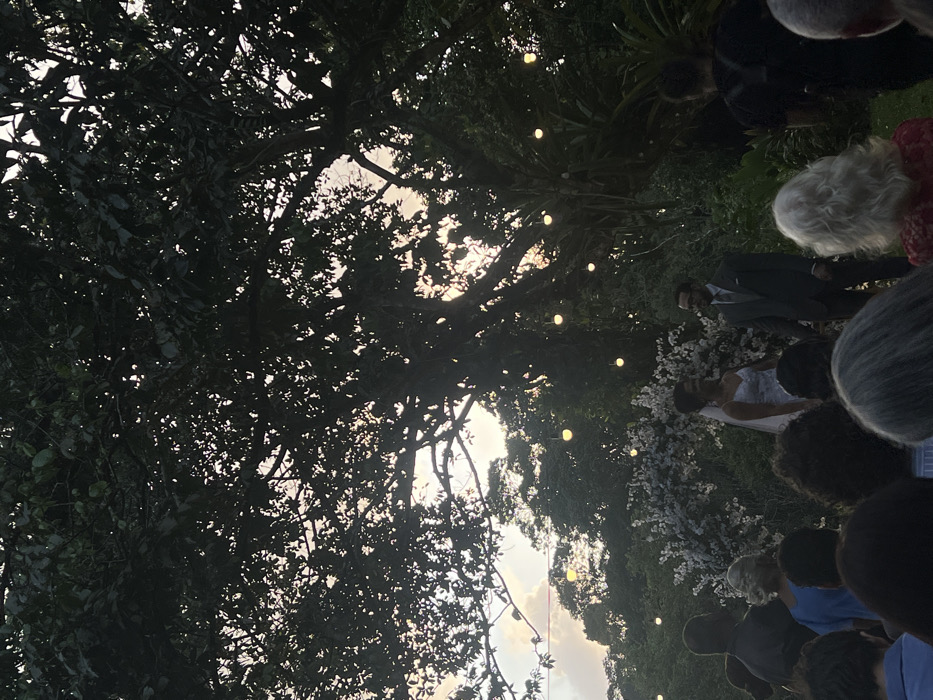 The scene depicts an outdoor gathering, identified as taking place in Camaragibe, Brazil, during the late afternoon or early evening. The ambient light indicates dusk, supplemented by approximately fifteen spherical string lights suspended across the setting. In the midground, two central figures are positioned. A female, presumed to be a bride, wears a white strapless gown and a white veil, and has dark hair. She stands to the left of a male, presumed to be the groom, who is dressed in a dark suit, light shirt, and tie, and has facial hair and eyeglasses. They stand before a white floral arch, which is set against a backdrop of dense green foliage. The foreground contains the blurred heads and shoulders of numerous individuals, facing towards the central figures, indicating their role as attendees. Hair colors among these individuals vary, including dark, grey, and blonde. On the far right, a person in a dark shirt and backpack is visible, partially facing away. The environment is characterized by a dense canopy of large, mature trees with dark foliage, silhouetted against a sky showing gradients of light and faint coloration, consistent with sunset or twilight. Further green foliage is visible throughout the background.