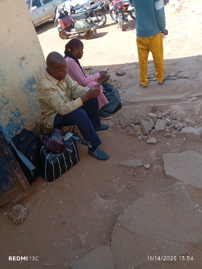 The image depicts an outdoor scene in Jos, Nigeria, showing three individuals and several vehicles on an unpaved, reddish-brown dirt ground with scattered rocks and broken concrete. In the left foreground, a bald, middle-aged man is seated, leaning against a light-colored wall with a faded blue lower section. He wears a light tan long-sleeved collared shirt and dark blue trousers, with dark blue slip-on shoes. He is holding and looking at a black smartphone. Next to him are a black backpack and a black-and-white striped duffel bag with a dark red item on top. To his right and slightly behind him, a woman with dark hair (possibly in braids or cornrows) and a red head covering is also seated, leaning against the same wall. She wears a red and white striped long-sleeved shirt and dark trousers, with dark green slip-on shoes. She is likewise holding and looking at a black smartphone. A black plastic bag rests near her. In the right middle ground, a man stands facing away from the camera. He is wearing a light blue long-sleeved sweater with a white horizontal stripe and bright yellow baggy trousers, with dark shoes. In the background, several vehicles are parked on the dirt. A vintage-style green scooter with a red bag on its seat is visible, along with multiple motorcycles and a partially visible light-colored car on the far left. The scene is brightly lit, indicating daytime. The ground is uneven, consistent with an informal outdoor area or transport hub. A "REDMI 13C" watermark is visible in the bottom left, and a timestamp "11/14/2025 13:54" in the bottom right.