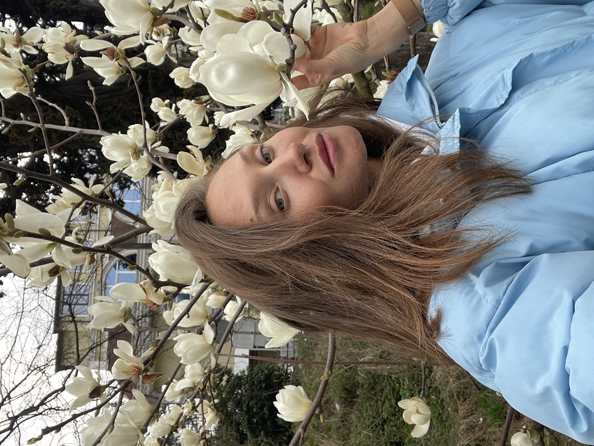 An outdoor, chest-up portrait features a young adult female in what is identified as Sochi, Russia. The subject, possessing long brown hair, light-colored eyes, and fair skin, is positioned slightly off-center to the left. She wears a light blue puffer jacket, partially unzipped over a white collar, and a rose gold-toned mesh watch on her right wrist. She looks directly at the camera with a slight smile while her right hand gently holds a large white magnolia blossom. The foreground and midground are dominated by the branches of a magnolia tree in full bloom, displaying numerous large, white, cup-shaped flowers, some revealing reddish-brown anthers. In the background, a multi-story building of light-colored masonry with darker architectural details and an arched, blue-tinted window is visible. Sparse, bare tree branches and minimal green foliage are also present in the deeper background. The scene is illuminated by soft, diffused light, indicative of an overcast sky during springtime.