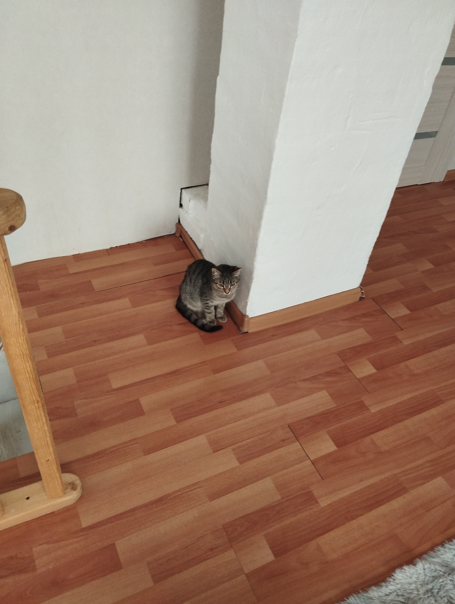 A tabby cat sits near the base of a white wall column on a brown, planked floor. The environment includes a wall with a wood railing on the left, and a door in the upper right corner. The flooring appears to be a wood-look laminate. The location is Krasnogorskoye, Russia.