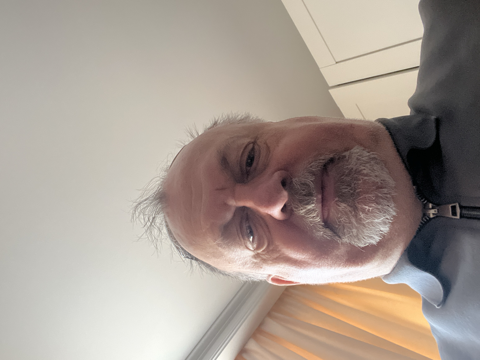 A close-up, head-shot style photograph of an older, white-skinned man with a grey beard and receding grey hairline. He is wearing a zip-up jacket. The background includes a white ceiling, white cabinets, and light-colored blinds. The image is angled upward towards the man's face. There is no indication of the location being Podolsk, Russia.