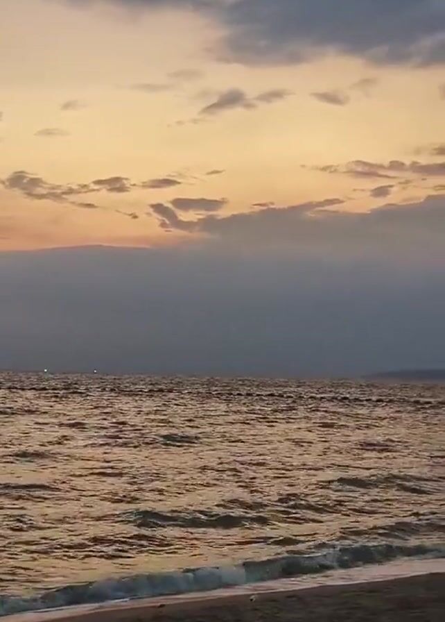 body of water at sunset or sunrise, with a sandy beach in the foreground. The water is choppy with small waves coming to shore. The sky is filled with clouds, some dark and some with golden hues from the sun. Lights can be seen in the distance across the water.