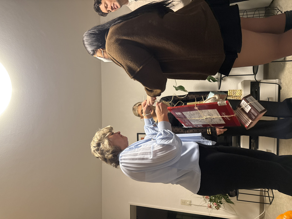 A group of people gather in a well-lit room. An older woman with blonde, curly hair wears a light blue blouse and black pants. She holds a gift box tied with twine, while another woman in a brown sweater reaches out to adjust it. Other individuals are partially visible at the top of the frame and in the background, along with a potted plant and decorative items on a side table. The scene suggests a gift-giving or festive occasion.