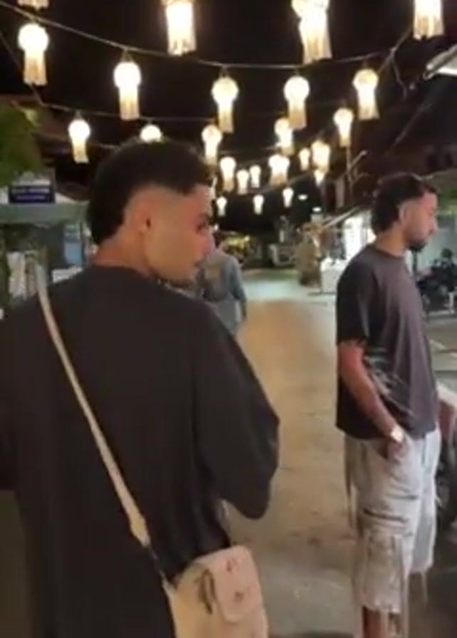 Two young men are walking down a street at night. There are streetlights in the shape of lanterns overhead. One of the men is carrying a pink and yellow bottle. There are motorbikes parked on the side of the street.